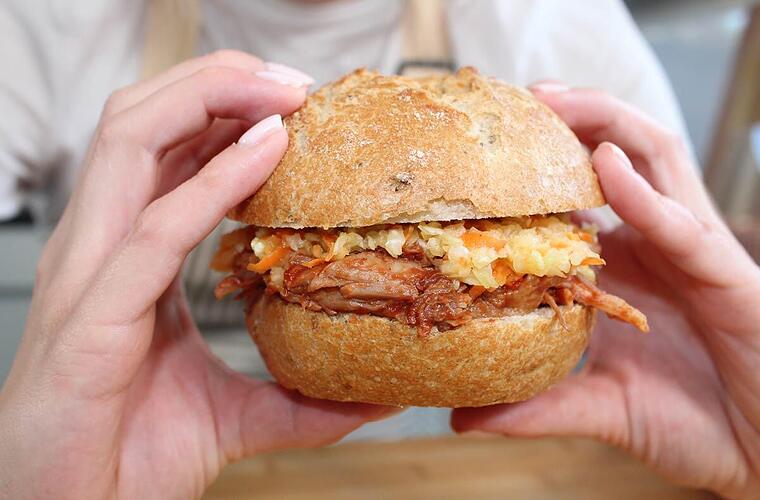 Die Brötchen vorsichtig aufschneiden und unser Pulled Schäuferla großzügig auf der Unterseite verteilen. Darauf den knackigen Krautsalat!