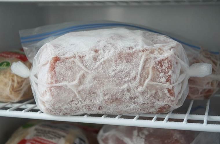 Gefrierbrand entsteht, wenn Fleisch nicht luftdicht verpackt wird – die Feuchtigkeit entzieht sich dem Fleisch und bildet eine Eisschicht auf der Oberfläche. Das Fleisch ist zwar nicht gesundheitsschädlich, büßt aber deutlich an Geschmack und Qualität ein.