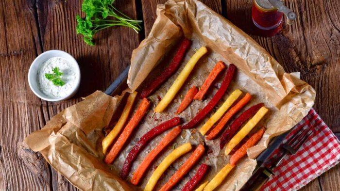- Süßkartoffeln, Pastinaken und Kohlrabi schälen und in längliche Stifte schneiden. Den Backofen auf 200°C Umluft vorheizen. Ein Backblech mit Backpapier auslegen.