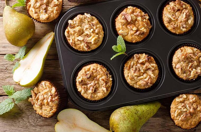 - Den Teig in Muffinförmchen füllen. Die Muffins mit den restlichen Birnenstücken und grob gehackten Walnüssen verzieren und diese leicht eindrücken. Die Muffins für 20-25 Minuten backen.