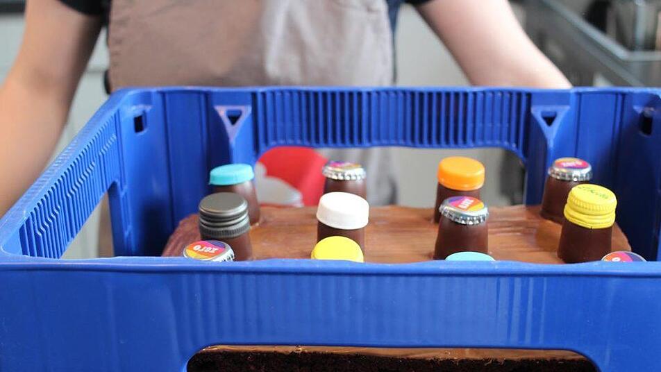 Zum Schluss legen wir den Kuchen vorsichtig in den Bierkasten und fertig ist unser Bierkasten-Kuchen.
