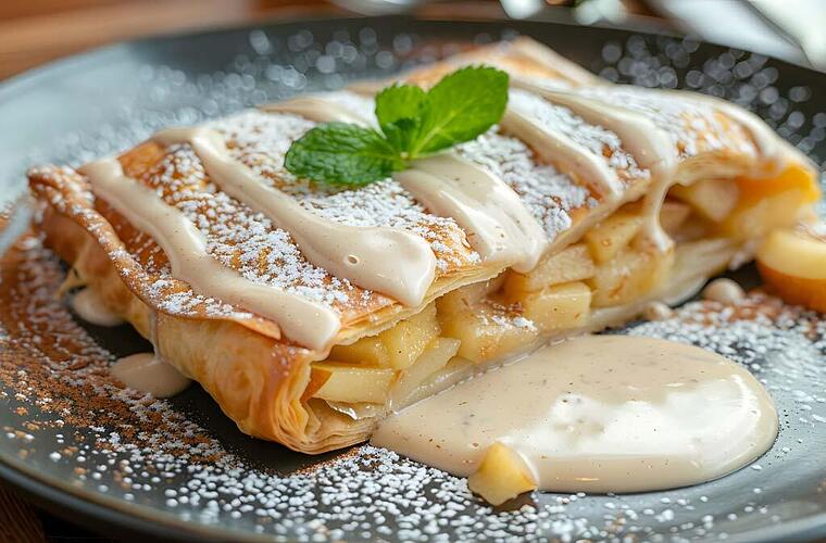 - Den Apfelstrudel etwas abkühlen lassen, in Stücke schneiden und mit Puderzucker bestäuben. Mit warmer Vanillesauce servieren.