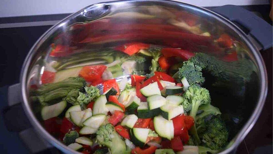 Das Gemüse in einen Topf oder in eine große Pfanne mit hohem Rand geben und zum Kochen bringen.
