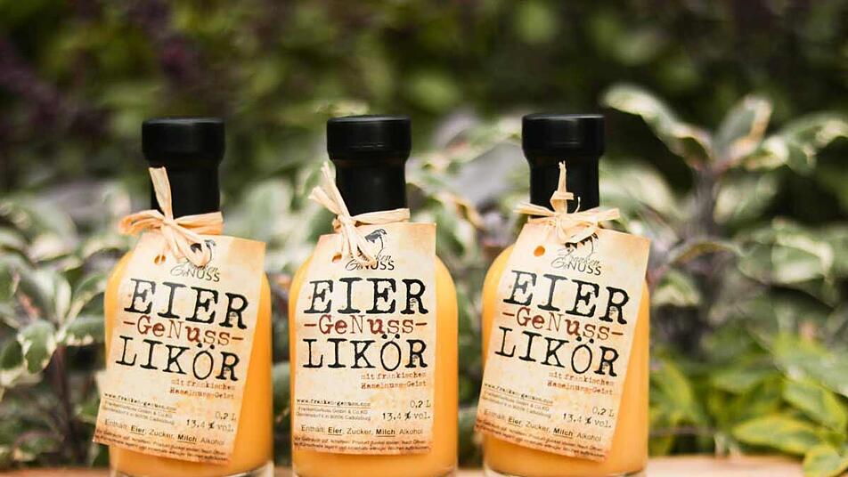 Dieser ist verfeinert mit fränkischem Haselnuss-Geist und hergestellt mit den Eiern vom Huhn im Haselnussfeld. Der Eier-GeNuss-Likör hat 13,4% vol.