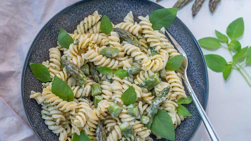 - Sind die Nudeln fertig, serviert ihr sie zusammen mit den Spargelstücken und dem Pesto. Wer noch etwas Parmesan übrig hat, kann diesen zum Garnieren verwenden.