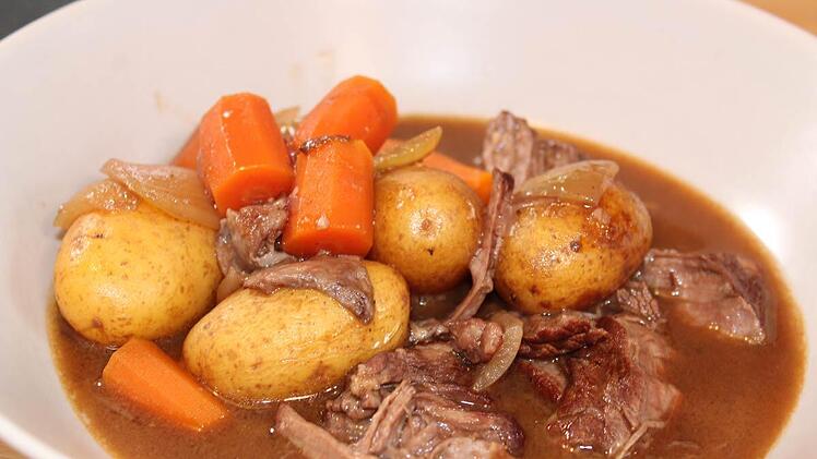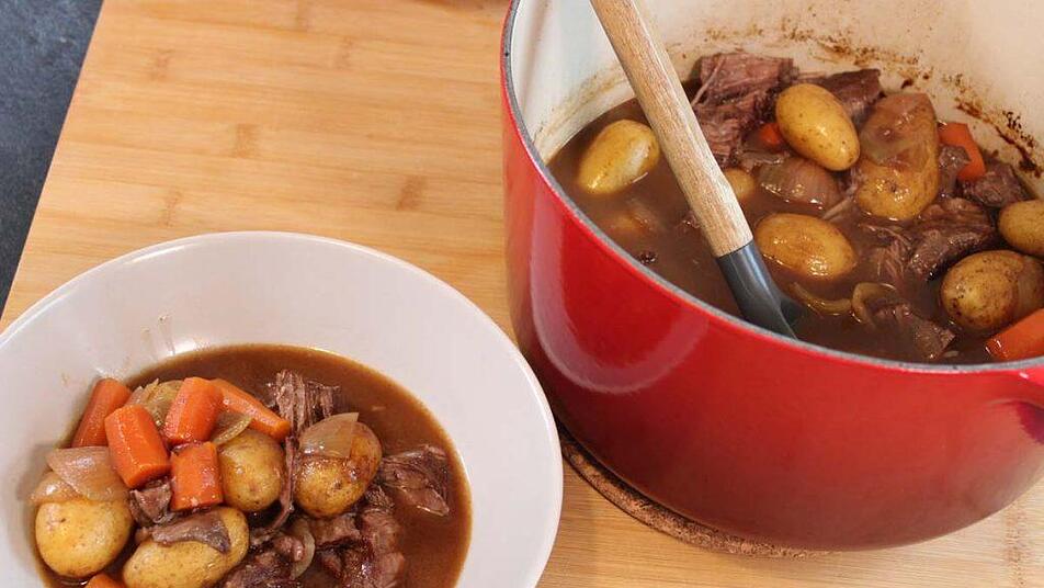 Den Deckel auf den Topf geben und alles etwa 3 Stunden bei niedriger Hitze auf dem Herd schmoren lassen. Alternativ bei 160 °C Umluft im Backofen garen.