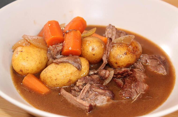 Mit Brühe erneut ablöschen, das Fleisch zurück in den Bräter geben und Kartoffeln, Karotten und Lorbeerblätter hinzufügen.