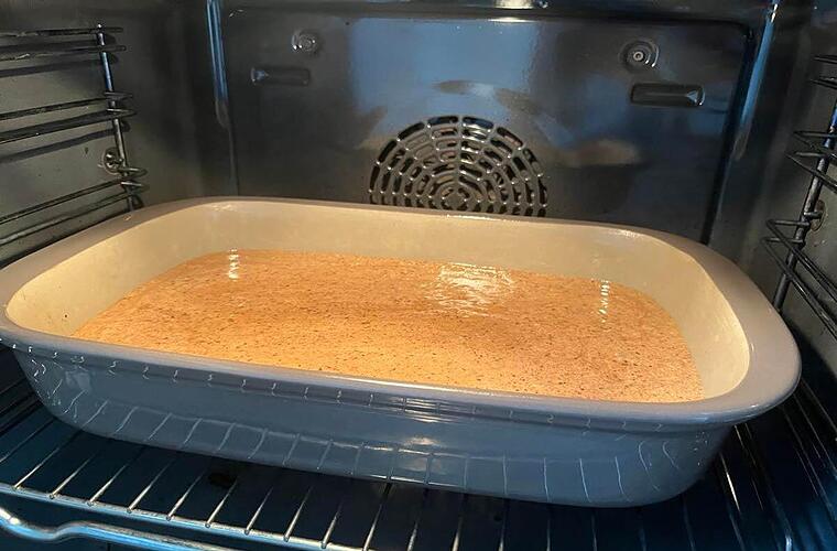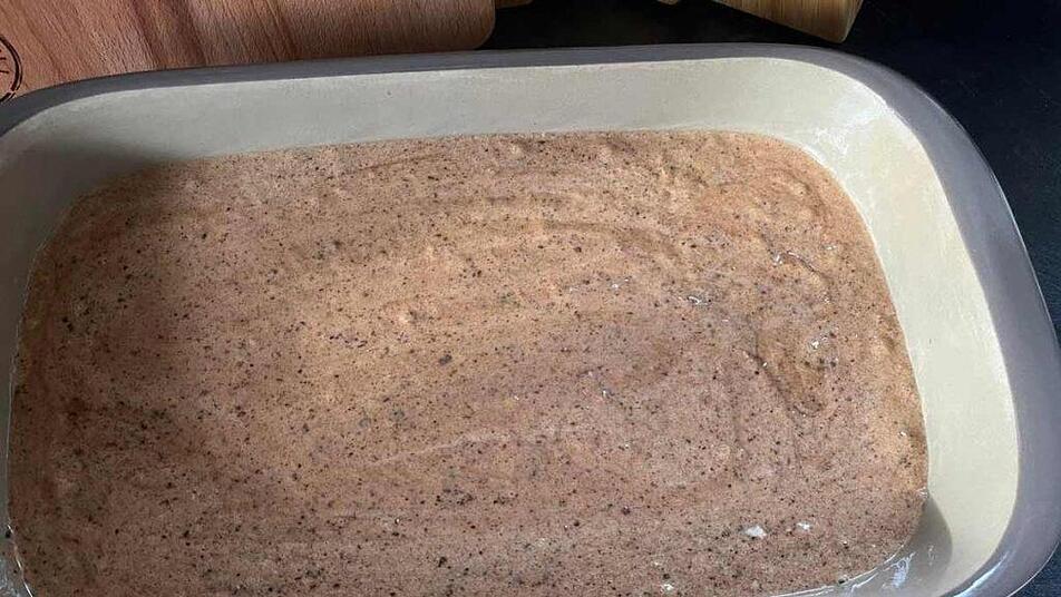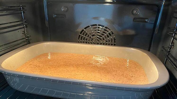 Den Teig in eine gefettete Form geben und gleichmäßig verstreichen.