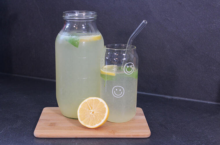 - Schließlich wird die vierte Zitrone in Scheiben geschnitten und zusammen mit der Minze und dem restlichen Wasser der Karaffe hinzugefügt.