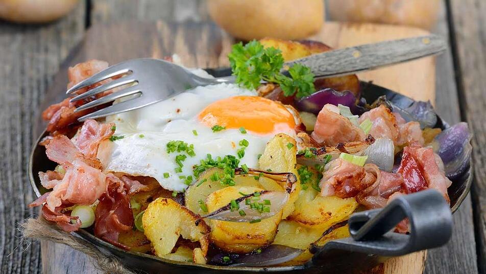 - Das Öl in einer hohen Pfanne erhitzen, dann den Speck und die Zwiebel darin anbraten. Dann herausnehmen und die Kartoffelscheiben darin knusprig anbraten. Anschließend den Speck und die Frühlingszwiebeln dazugeben.