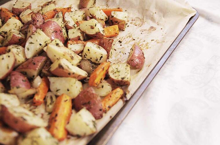 - Alles gut mit Öl, Kräutern, Salz und Pfeffer vermischen und auf einem mit Backpapier ausgelegtem Backblech verteilen.