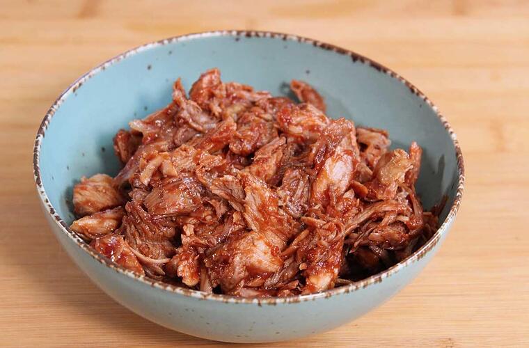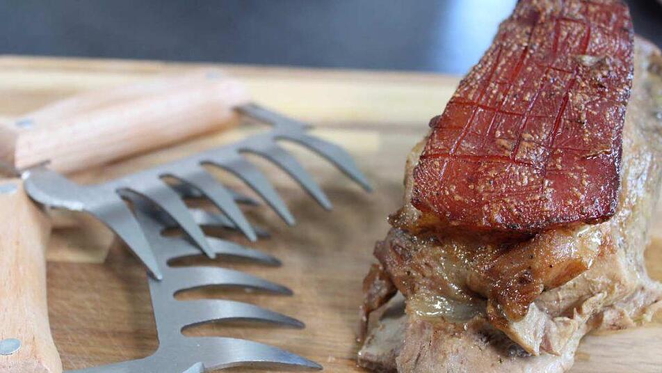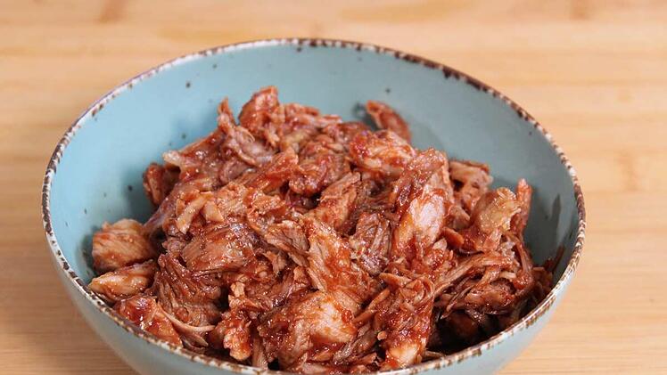 Das Fleisch mithilfe von Gabeln in kleine Stücke zerpflücken. Besonders gut gelingt das mit sogenannten Fleischkrallen, diese sind aber nicht zwingend notwendig!