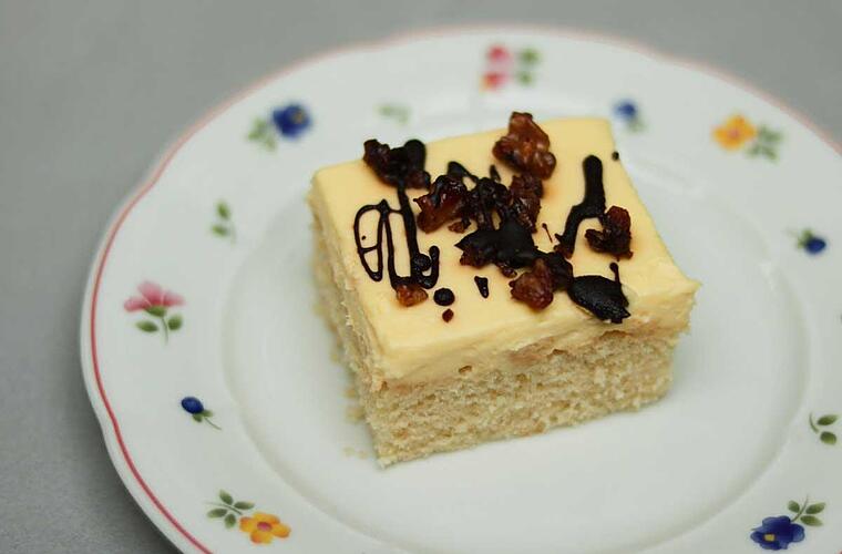 - Die Walnüsse mit Butter und Zucker rösten und erkaltet auf der Creme verteilen. Den Schokoguss erwärmen und den Kuchen damit verzieren.