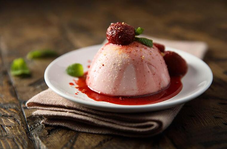 - Die Panna Cotta auf einen Dessertteller stürzen und das Erdbeer Kompott darübergeben. Mit frischer Minze und einer ganzen Erdbeere dekorieren.