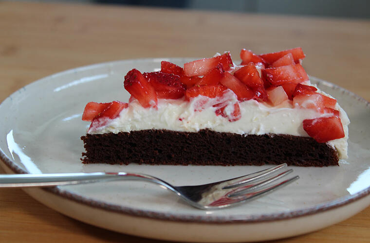 Für dieses Rezept wird als Boden kein Biskuit- oder Rührteig verwendet, sondern ein Brownie-Teig. Der Boden ist dadurch besonders schokoladig und würde auch solo ohne die Sahne und Erdbeeren funktionieren. Wir verwenden dafür unser liebstes Brownie-Rezept, das durch einen einfachen Trick gesünder als herkömmliche Rezepte ist.