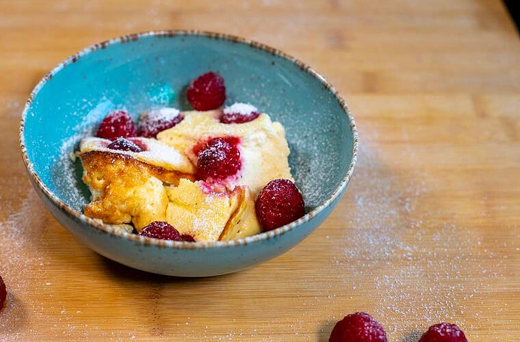 - Auflauf dekorieren: Die fertige Masse gleichmäßig in die eingefettete Auflaufform geben. Das Obst nach Wahl auf der Oberfläche verteilen – dabei leicht andrücken, damit die Früchte nicht verbrennen. Tipp: Himbeeren und Heidelbeeren sorgen für eine fruchtige Frische, während Apfelstücke dem Auflauf eine herbstlich-winterliche Note verleihen.
