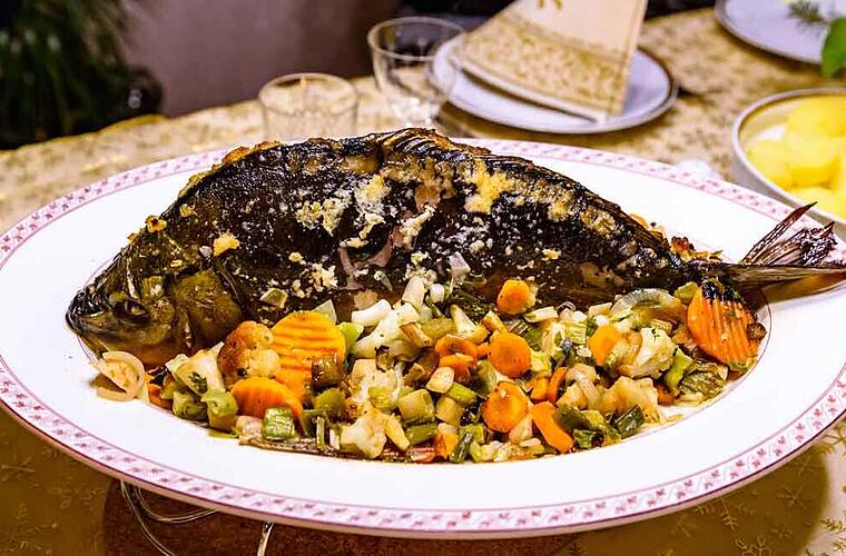 - Den Bräter inklusive Inhalt in den Backofen geben und bei 160 Grad circa 45 Minuten backen lassen. Regelmäßig etwas Wein nachgießen und darauf achten, dass der Karpfen gut im Fond liegt, regelmäßig übergossen wird und somit nicht zu trocken wird.