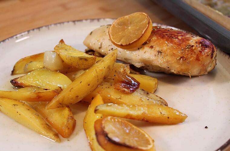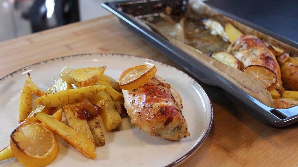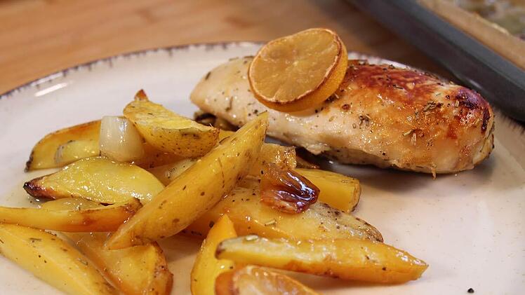 Das Backblech dann für 30 Minuten in den Ofen geben, bis die Kartoffeln und das Fleisch durch sind und schön Farbe angenommen haben.