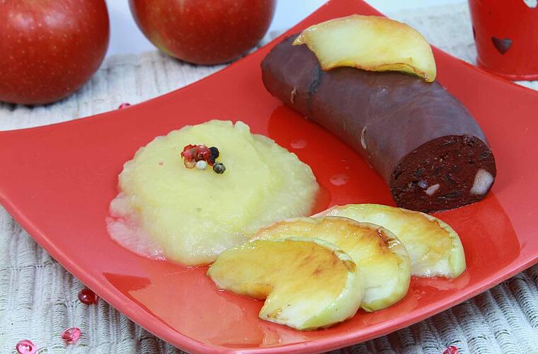 - Blutwurst pellen, in Mehl wälzen, in Pflanzenöl und etwas Butter braten.