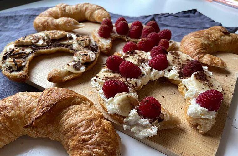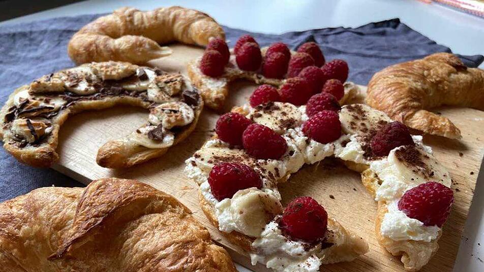 - Für diese Variation einfach die Schlagsahne steif schlagen, mit einem Spritzbeutel und einer Sterntülle auf ein halbiertes Hörnchen spritzen und dieses anschließend mit Himbeeren, Bananen und etwas Zimt verzieren.