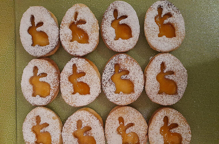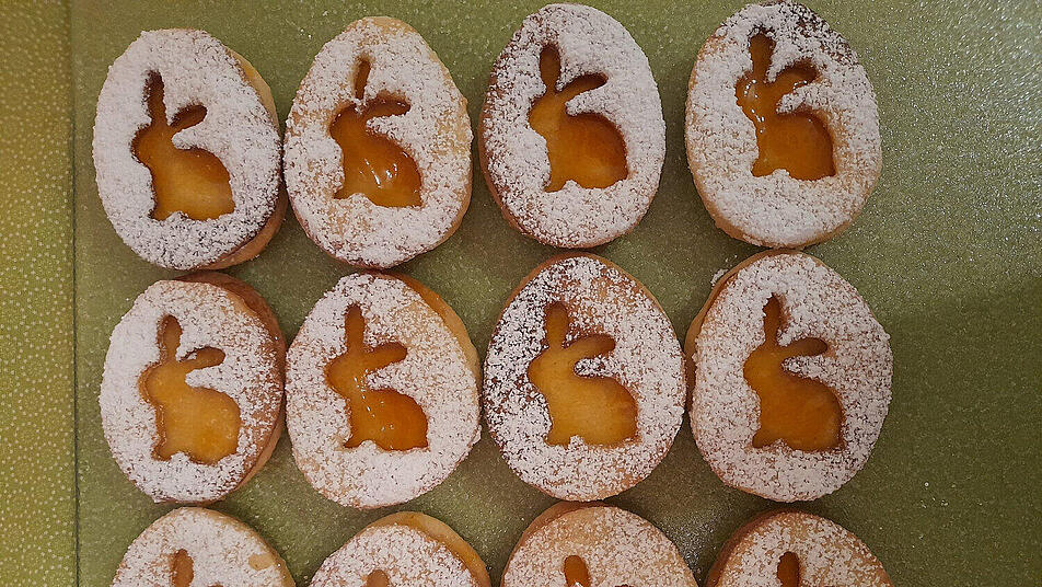 - Die Plätzchen erkalten lassen und anschließend immer ein Plätzchen mit Aprikosenmarmelade bestreichen und ein zweites Plätzchen darauf setzen. Wer mag, kann die Osterplätzchen vor dem Servieren noch mit Puderzucker bestreuen.