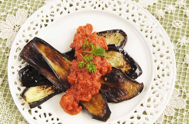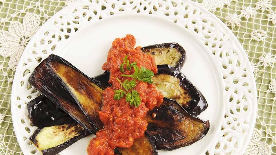 - Die Auberginen mit Küchenpapier trocken tupfen. Dann mit Olivenöl bestreichen und mit Knoblauch bestreuen und grillen. Die gegrillten Auberginen mit der Tomatensoße servieren.