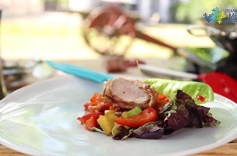 Der Genussbotschafter von Frankens Mehrregion, Wolfgang Link, und Opernsänger Christoph von Weitzel bereiteten dieses herzhafte Schweinefilet vom Grill zu. Das Fleisch wird mit Speck umwickelt und zusammen mit einem bunten Gemüse-Chutney serviert. Das Gericht ist einfach zuzubereiten und überzeugt mit frischen Zutaten und einer besonderen Kombination von Aromen, die es zu einem echten Genuss macht.
