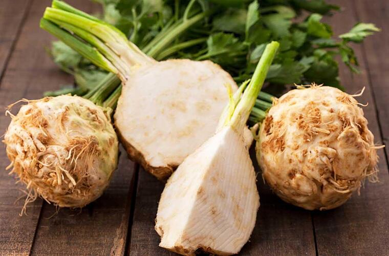 Tipp: Beim Einkauf ist darauf zu achten, dass die Knolle schön fest ist. Zudem lässt sich frischer Knollensellerie an einem saftigen Grün der Blätter erkennen