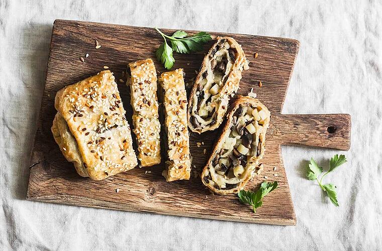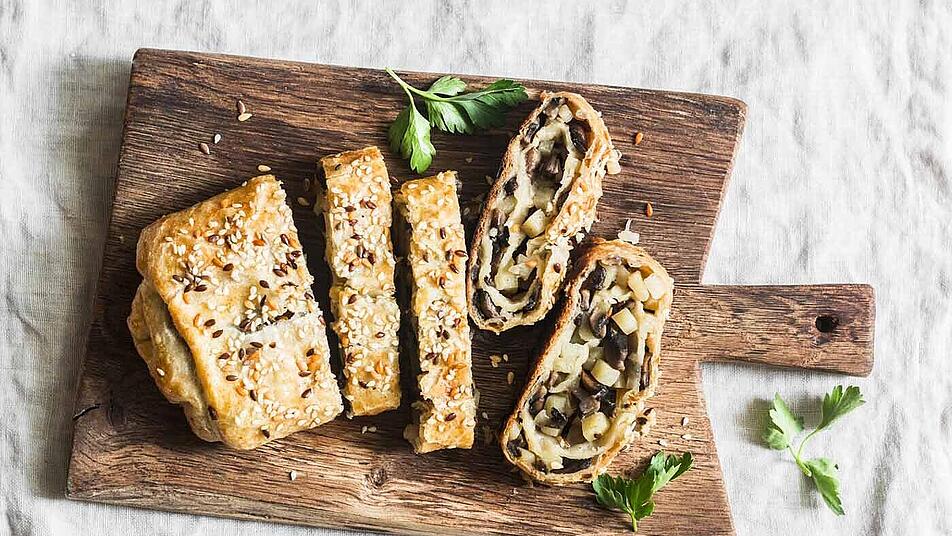 - Den Gemüse-Pilz-Strudel 35-40 Minuten auf der unteren Schiene goldbraun backen.