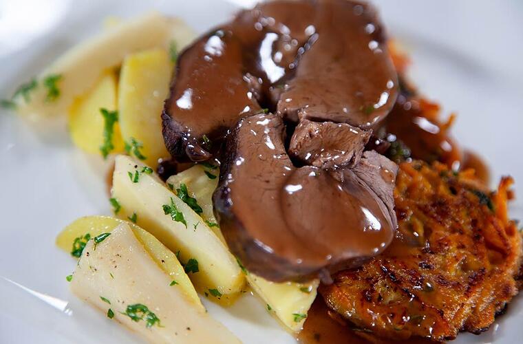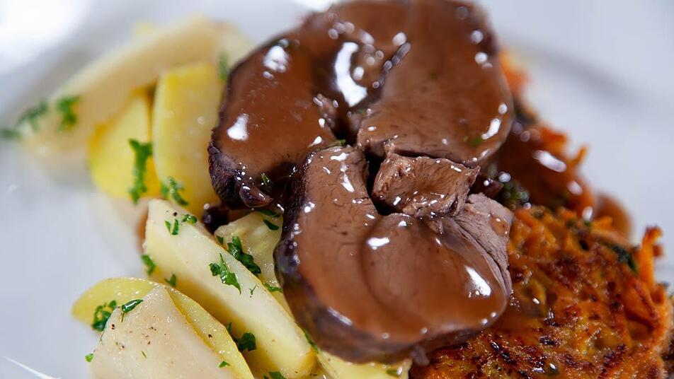 - Die Rehkeule vom Knochen lösen, in Scheiben schneiden und mit der Lebkuchensoße und den Beilagen servieren. Dazu passen Kartoffelklöße und ein Löffel Preiselbeeren.