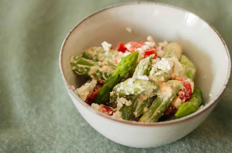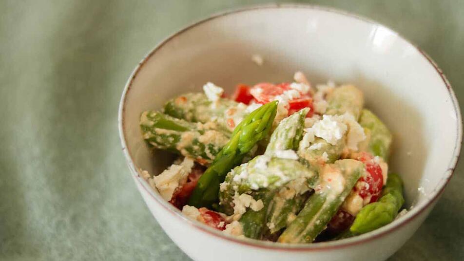 - Die Tomaten vierteln, die Zwiebel klein schneiden und den Feta mit den Händen zerbröseln. Alles zusammen mit dem Spargel in eine Schüssel geben und durchmischen.