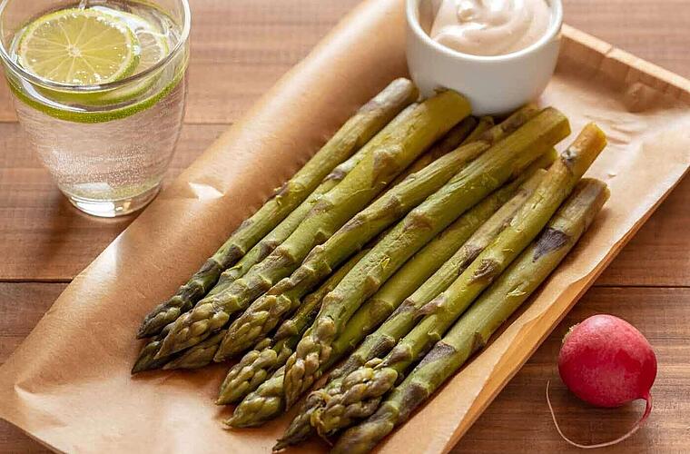 - Spargel mit Knoblauchöl bestreichen, mit Spargelgewürz würzen und auf dem Rost oder in der Pfanne ringsum zart braten.