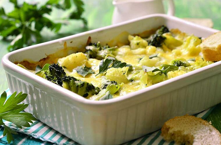 - Lege dann abwechselnd die Kartoffelscheiben und den Grünkohl in die Auflaufform und übergieße das Ganze am Ende mit der Eier-Sahne-Mischung.