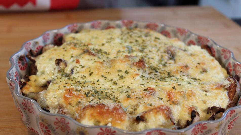 Kombination aus Kartoffeln und Pilzen Die Kartoffeln aus dem Ofen nehmen und die vorbereiteten Pilze darauf verteilen. Für extra Röstaromen die Pilze noch einmal kurz mit den Kartoffeln in den Ofen geben oder direkt die Ei-Käse-Mischung gleichmäßig darüber verteilen.