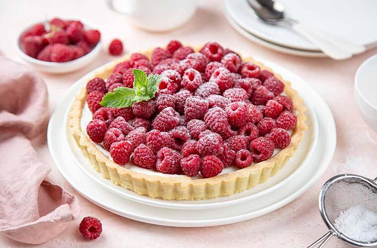 - Den Biskuit am Besten mit einem Tortenring umstellen, die Creme darauf geben und die Himbeeren darauf verteilen. Die Torte ca. 3-4 Stunden kühl stellen.