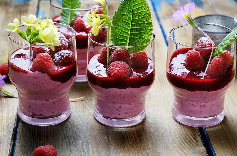 - Das Mousse muss für vier Stunden gekühlt werden. Die Grütze kann man anschließend heiß darübergeben, oder alles zusammen erkalten lassen. Kurz vorm Servieren werden die Gläser mit frischen Minzblättern, essbaren Blüten und den restlichen 100g Himbeeren dekoriert.