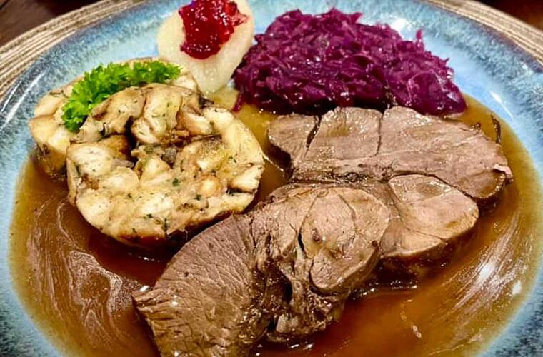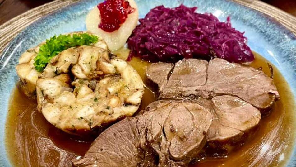- Die Hirschkeule mit der Sauce übergießen und mit Laugenknödeln, Blaukraut und Preiselbeeren servieren.