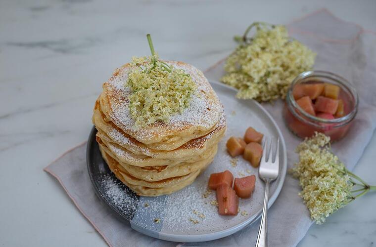 Pfannkuchen mag einfach jeder – und diese fränkische Variante mit Holunderblüten und Rhabarberkompott ist eine willkommene Abwechslung zu den klassischen Rezepten! Die zarten Holunderblütendolden, die es in Franken nur für kurze Zeit zwischen Mai und Juni gibt, werden direkt im Teig ausgebacken und verleihen dem Pfannkuchen ein wunderbar blumiges Aroma. Das passt hervorragend zur feinen Säure des Rhabarberkompotts – eine einfache, saisonale Leckerei, die nach Frühling schmeckt und garantiert für Begeisterung sorgt.