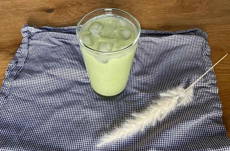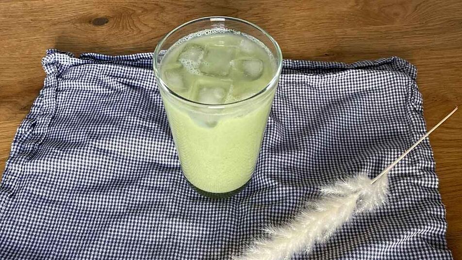 - Die Milch in ein hohes Glas füllen. Dann das aufgerührte Matcha dazugeben. Die Eiswürfel mit ins Glas geben und einmal umrühren. Fertig!