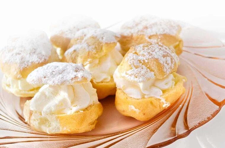 - Nach dem Backen von jedem Windbeutel einen Deckel abschneiden und das Gebäck auf einem Kuchengitter abkühlen lassen.