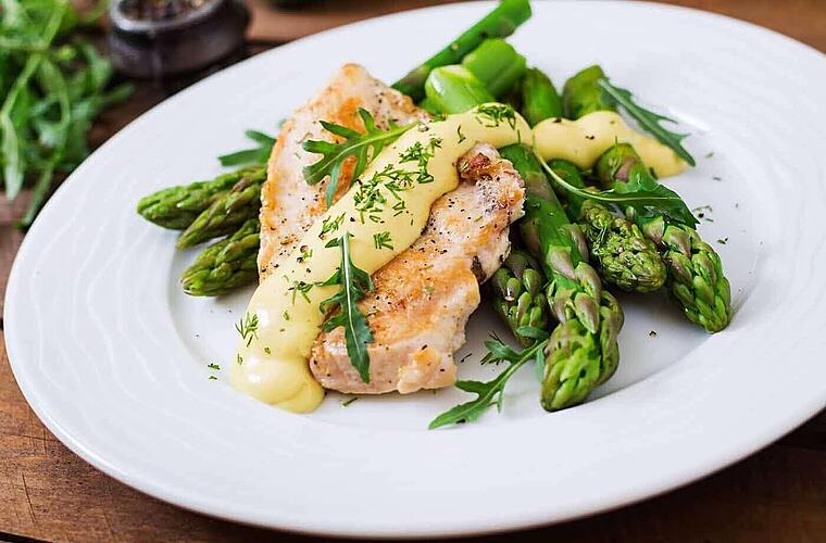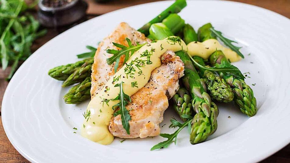 - Eigelbe mit Spargelfond schaumig schlagen, Olivenöl nach und nach unterrühren, mit Zitronensaft, Salz und Pfeffer abschmecken. Spargel auf Teller anrichten, mit Sauce überziehen, Hähnchenbrust daraufsetzen, mit Zitronenthymian garnieren und Rösti daneben mit anrichten.