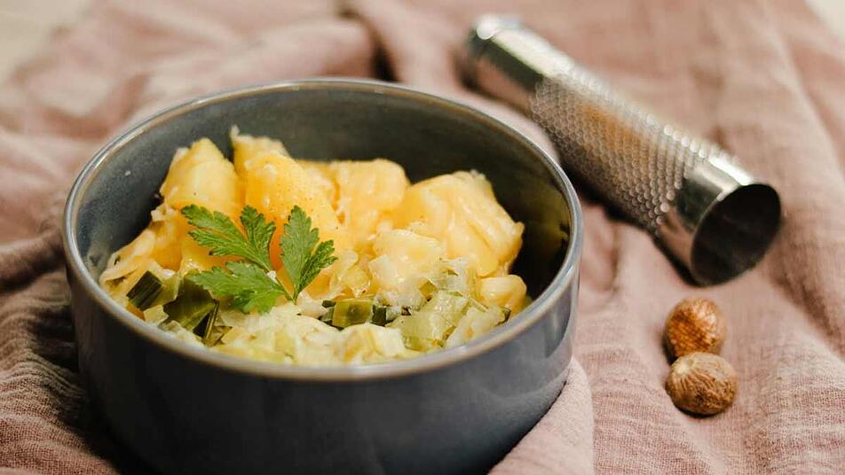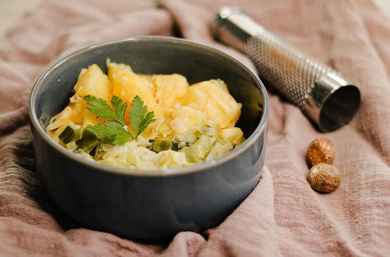 - Die Käsekartoffeln gemeinsam mit dem Sahne-Lauch servieren. Zuvor mit Salz, Pfeffer und Muskat abschmecken.