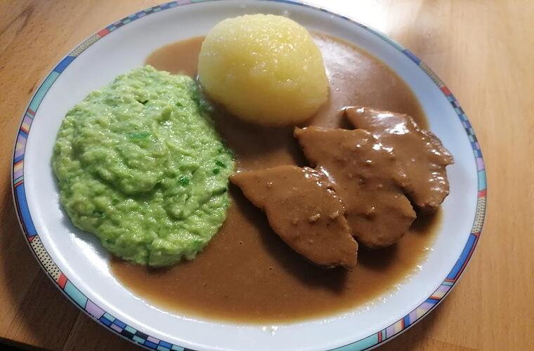 - Den Kalbsrahmbraten mit der Soße, dem Bamberger Spitzwirsing und den Kartoffelknödeln auf einem Teller anrichten.