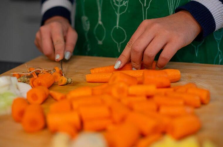 - Zuerst die Bandnudeln nach Packungsanweisung in Salzwasser kochen. Währenddessen die Karotten schälen.