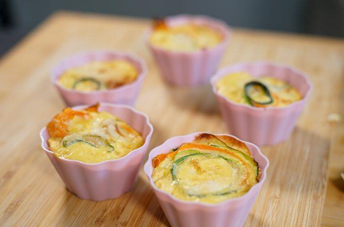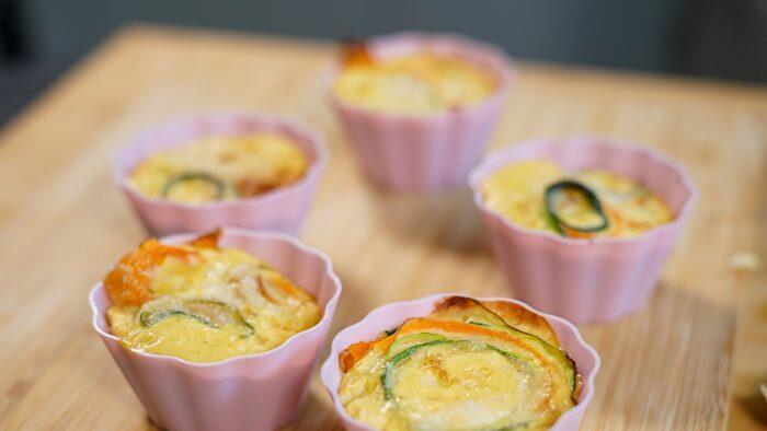 - Jetzt die Zucchini- und Karottenstreifen einrollen und in die Muffinformen legen. Die Eimasse gleichmäßig darübergeben.