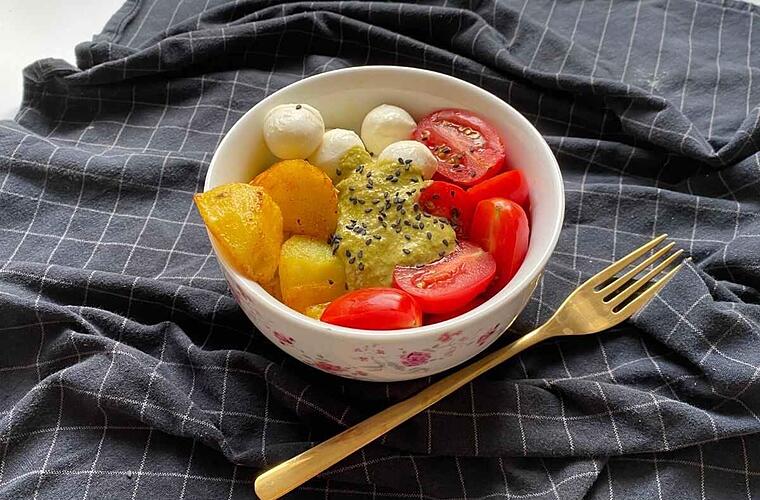 - Wenn die Kartoffeln goldbraun gebacken sind, kann die Bowl angerichtet werden. Dafür ein Drittel der Schüssel mit Tomaten und ein weiteres Drittel mit den Mozzarella-Bällchen auffüllen. Die Kartoffelwürfel dazugeben. Zuletzt das Pesto in die Mitte geben und die Bowl mit Sonnenblumenkernen oder Sesam verzieren.