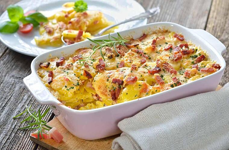 Kartoffelgratin ist ein echter Klassiker und darf in der Fränkischen Küche auf keinen Fall fehlen. Besonders gut passt es zu einem bunt gemischten Salat, oder auch zu Omas Fleischküchla. Wer es lieber vegetarisch mag, kann den Speck auch weglassen. Wir wünschen an Gudn!