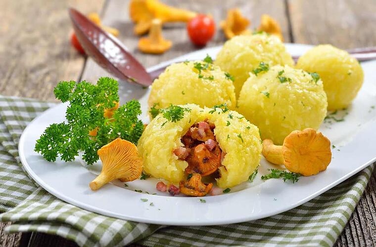 - Den Kartoffelteig in gleich große Portionen teilen. Jede Portion flach drücken, in die Mitte etwas von der Champignon-Speck-Füllung geben und den Teig vorsichtig um die Füllung herum zu runden Knödeln verschließen.