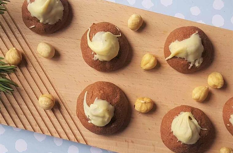 - Die Teigrolle danach in 30 Scheiben (1 cm dick) schneiden. Jede Scheibe auf die Arbeitsfläche legen und 1 Haselnuss darauflegen. Dann die Seiten rundum hochklappen und einen kleinen Berg formen. Die Berge auf einen mit Folie oder Papier belegten Teller setzen und 10 Minuten ins Tiefkühlfach stellen.
