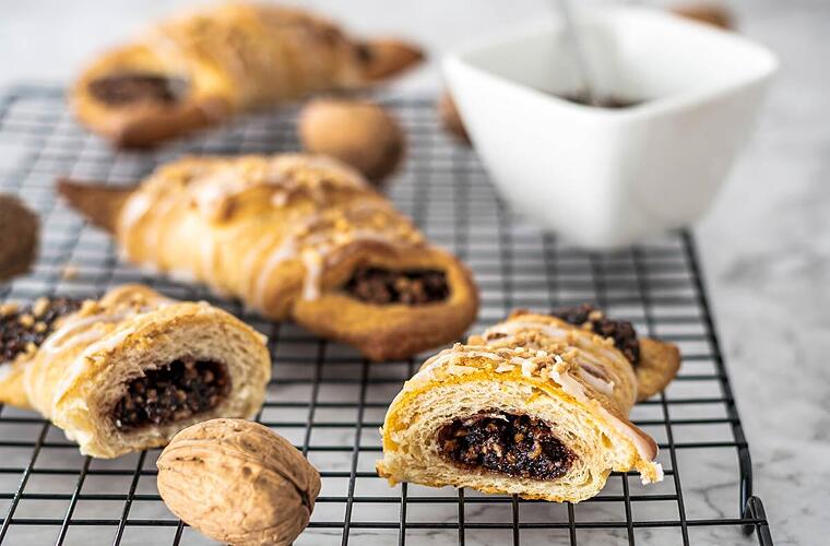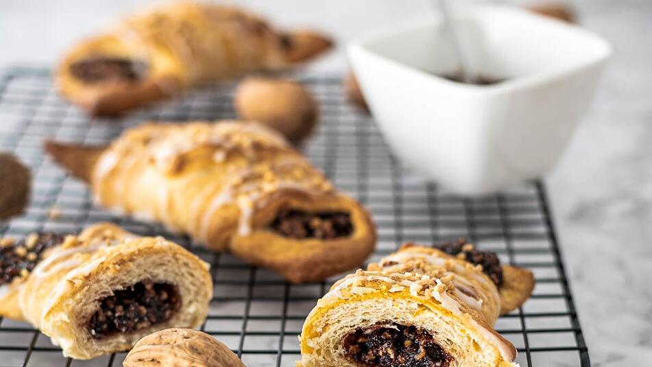 Der lustige Name für diese Haselnuss-Hörnchen aus Plunderteig kommt vom Kurort Bad-Kissingen. Zum Einen mag man hier Nüsse - zum Anderen sollen die Kurgäste ihr Frühstück meistens im Flanieren eingenommen haben: Was eignet sich dazu besser als gefüllte Hörnchen?